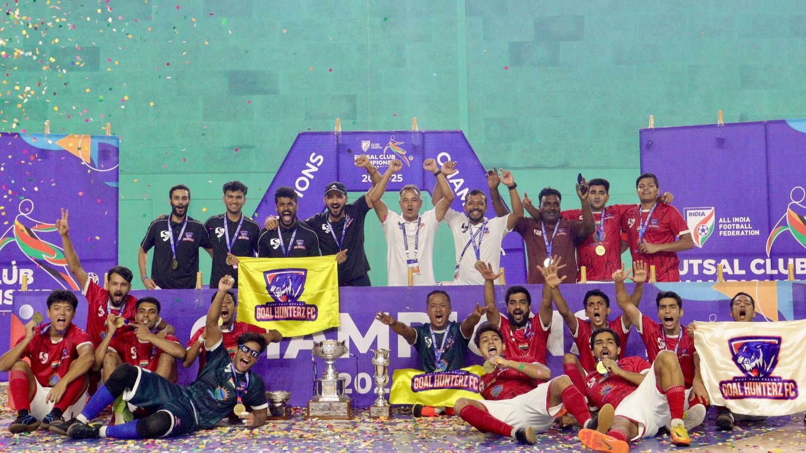 RUDRAPUR: Mahip Adhikari rose to the occasion with a sensational hat-trick as Goal Hunterz defeated Bhawanipore FC 4–2 to lift the AIFF Futsal Club Championship 2024–25 title at the Shri Manoj Sarkar Stadium – Shivalik Hall on Monday, August 18, 2025.