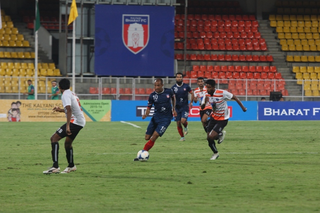 Bharat FC had yet another chance a minute later when Wadoo sent a long ball for Bright, who flicked it for Subash Singh. As the striker was heavily marked, he tried to set up Lester Fernandes instead, but he was tackled badly, but the referee found no offence.